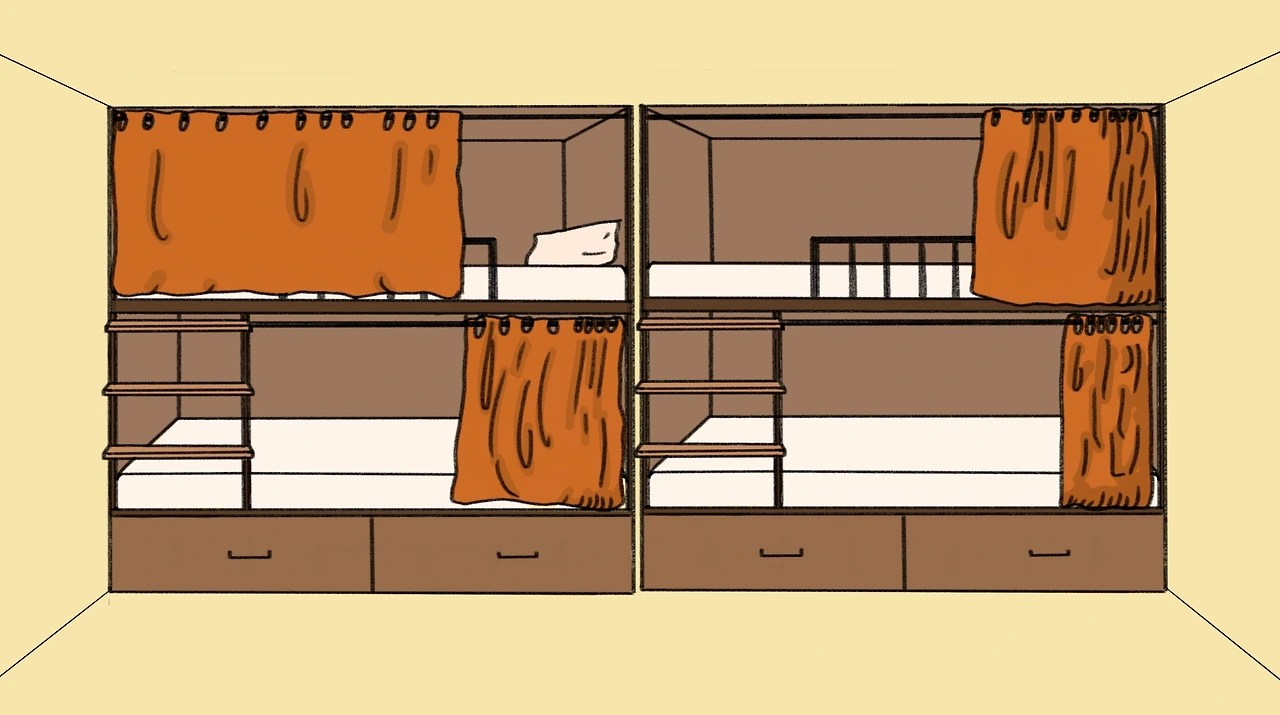 한 5분 즈음 지났을 무렵, 전등 스위치를 누르는 소리와 함께 커튼 안으로도 밝은 빛이 조금 들어왔다. 문이 열렸다 닫혔다 하는 소리와 함께 사람들의 속닥거리는 말소리가 들렸다. 계속되는 말소리에 잠이 조금 달아난 나는 커튼을 살짝 열어 밖을 확인했다. 내 옆 침대를 사용하던 스웨덴인 2명이 한 명은 바닥에, 한 명은 침대에 앉아 이야기를 하고 있었다.