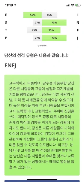 너무 놀라고 반가워서(?) 친구에게 결과를 공유했더니 요즘 유행하는 다른 MBTI 테스트도 해보라고 해서 시도해 봤더니 원래대로 'ENFJ' 유형이 나왔다.