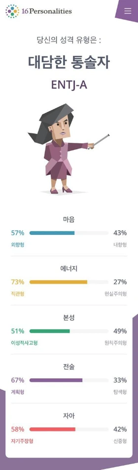그러던 얼마 전 다시 MBTI 테스트를 해보았고 놀랍게도 내가 그토록 바라던 'ENTJ' 유형이 나왔다.