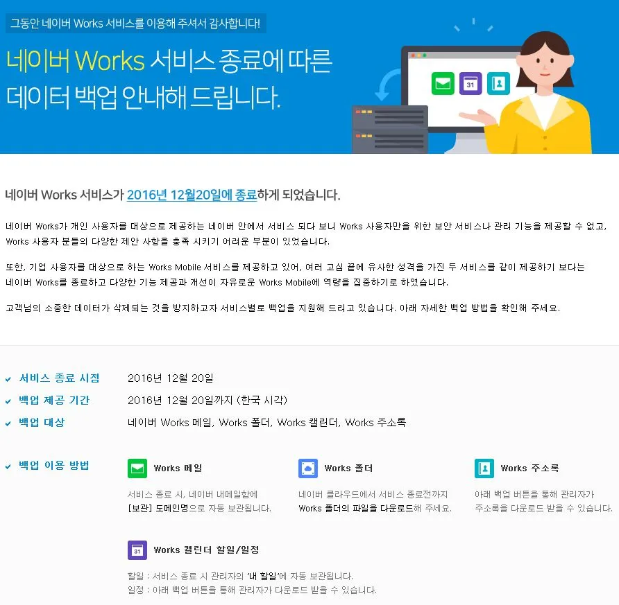 네이버 서비스 내에서 제공하던 네이버 Works 서비스가 2016년 12월 20일부로 서비를 종료한다고 한다. (관련 내용은 네이버 로그인 후, 메일 서비스 화면 내 공지를 참조할 수 있다.) 이와 함께 10월 27일부터 기업에 무료로 제공하던 네이버 Works 모바일의 요금체계를 라이트/베이직/프리미엄 3단계로 유료 요금제로 개편하는 것을 보면, 기업 서비스 강화와 시장 점유 확대가 목적이라고 생각해볼 수 있다. (유료화를 통한 자금 확보와 유료화에 맞는 고품질 서비스 개발과 같은 순환 구조를 만들어 국내 협업 솔루션 시장에서 영향력 확대까지 고려할 수 있다.)