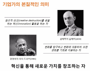 - 슘페터 : 새로운 방식으로 새로운 상품을 개발하는 지속적 기술 혁신을 통해 창조적 파괴를 실행하는 기업가의 노력이나 의지, 창조적 기쁨을 의미