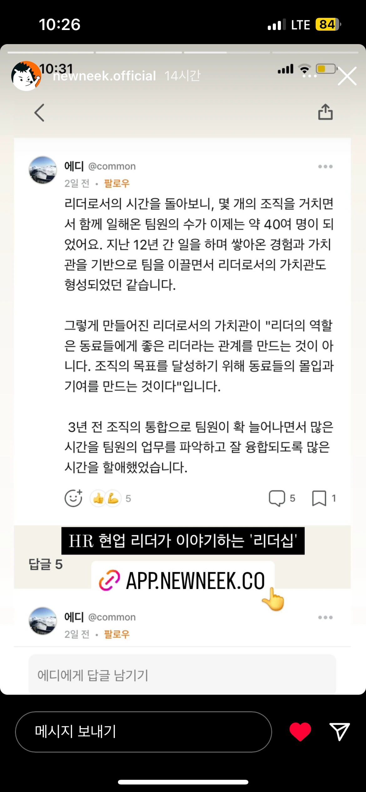 아직 갈 길이 멀지만 긍정적인 변화의 경험을 바탕으로 최근 뉴닉 커뮤니티의 지식메이트 2기로 뉴닉 커뮤니티 내 그간 작성했던 리더로서의 경험과 생각을 공유하기 시작했다. 또 새로운 배움과 경험, 함께 하는 사람들이 주는 동기부여를 통해 또 다른 성장을 만들어 볼 예정이다.