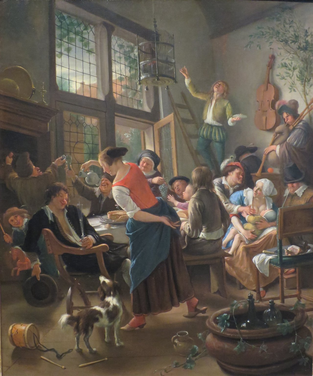 네덜란드 풍속화가 얀 스텐의 작품인 이 그림도 마찬가지다. 많은 사람으로 시끌벅적하고 꽉 찬 듯한 집 안의 풍경이다. 반짝이는 금색 옷을 입은 여자아이는 선물 받은 사탕바구니와 세례 요한 인형이 매우 흡족한 듯 밝은 표정을 짓고 있다. 아이의 옆에 있는 울고 있는 남자아이는 어떠한 연유에서 울고 있는지 모르겠지만 그를 가리키며 웃고 있는 곱슬머리의 작은 남자아이의 표정이 짓궂다. 아마 울고 있는 아이는 산타클로스의 유래인 성 니콜라스로부터 선물을 받지 못한 것은 아닐까? 이처럼 대가족, 혹은 정다운 이웃이 한 집안에 모여 웃거나 울거나 놀라거나 비웃거나 등 다양한 감정들이 생동감 넘치게 표현되고 있다. 웃음소리와 말소리가 끊이지 않을 것만 같은 왁자지껄한 분위기 속에서 서민들이 한데 모여 어울리는 화목한 모습은 따듯하면서도 아름다워 보인다.