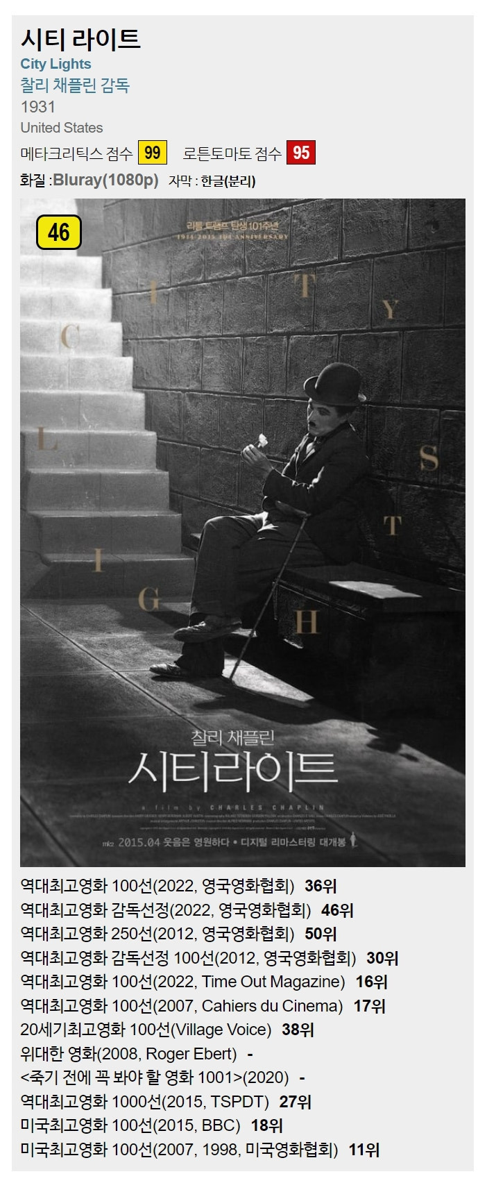 아주 노골적인 설정이고 어떤 의미에서는 신파적인 내용이지만 볼 때마다 깊은 감동을 주는 이유는 이 사회의 가장 밑바닥에 있는 사람(채플린)이 경제적으로는 도리어 자기보다는 좀 낫지만 눈먼 장애를 가진 소녀를 온 힘을 다해 돕는다는 점이다. 자기를 위해서는 단 한 푼도 남기지 않고 범죄의 누명을 쓰면서.