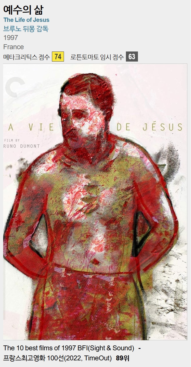 그래서 뒤몽의 영화를 언젠가는 좀 접해야겠다고 벼르고 있었는데, 이상하게도 포스터를 보면 정이 가질 않았다. 전형적인 할리우드 영화 스타일처럼 느껴지기 때문이다. 게다가 종종 영화 스틸 사진을 보더라도 밝고 화사한 장면이 대부분이라서 도대체 왜 <카이에 뒤 시네마>가 이 작가를 집요하게 주목하는지 이해하기 어려웠다. 그러던 중 어제 처음으로 (그냥 일종의 변덕으로) 다짜고짜 그의 첫 장편 데뷔작인 <예수의 삶>을 틀어버렸다. 이 영화의 포스터는 다른 영화와 달리 매우 추상적이다. 어떤 분위기, 어떤 스타일, 어떤 내용인지 종잡기가 어렵다. 뒤몽이 그 후에 잔 다르크를 다룬 영화 2편을 만들었고, 조각가 까미유 끌로델을 다룬 영화도 만들었으니 실제로 예수를 다룬 것으로 생각하기도 했다. 물론 그 해석은 매우 색다르고 도전적일 테지만.