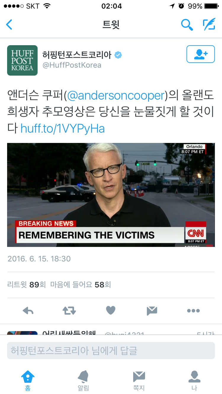 얼마전 스스로 게이라 밝힌 CNN 기자가 어제 올랜도 총기사건에 희생된 사람들의 이름과 나이와 그들이 어떤 사람이었는지, 무엇을 사랑했는지, 어떤 꿈을 꾸었는지 일일이 얘기해 주며 울먹입니다.