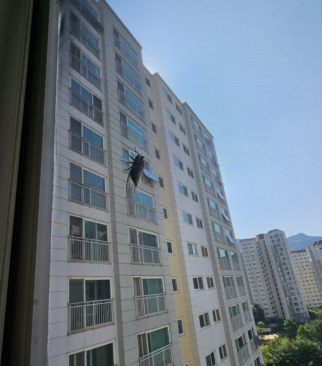 매미도 나무에 매달려서 나무만 보기보다 아파트에 매달려서 아파트 안을 보고 싶었나 봐. 사람들 살아가는 모습을 구경하고 싶은지, 소리도 안 내고 안을 보고 있다. 노트북 앞에서 꼼짝 안 하고 타자 치는 내가 저를 닮았다고 생각하는지 몸을 틀어서도 보고.