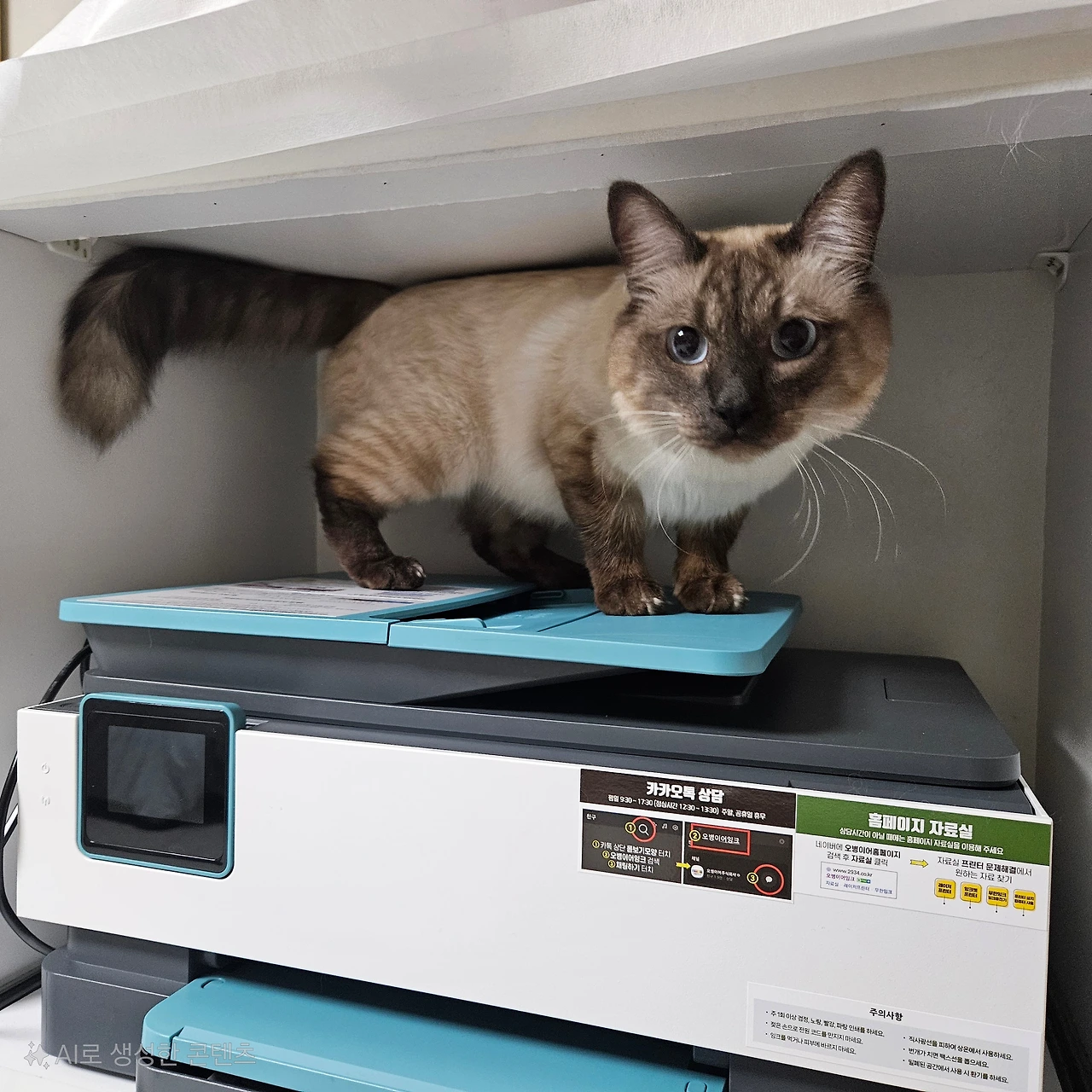 연근이가 프린터 위에 올라가는 걸 좋아한다. 일부러 장 위에 올려놓았던 프린터를 안에 넣었는데도 올라가서 제 몸을 뽐낸다.
