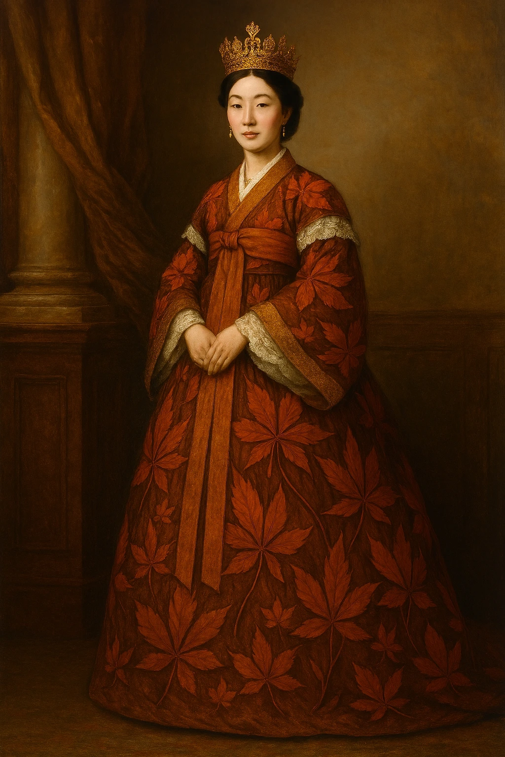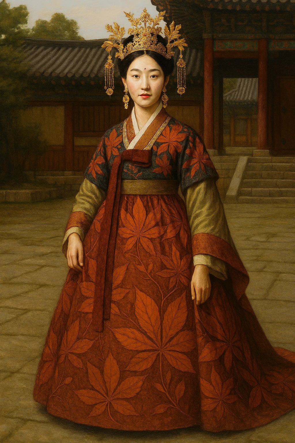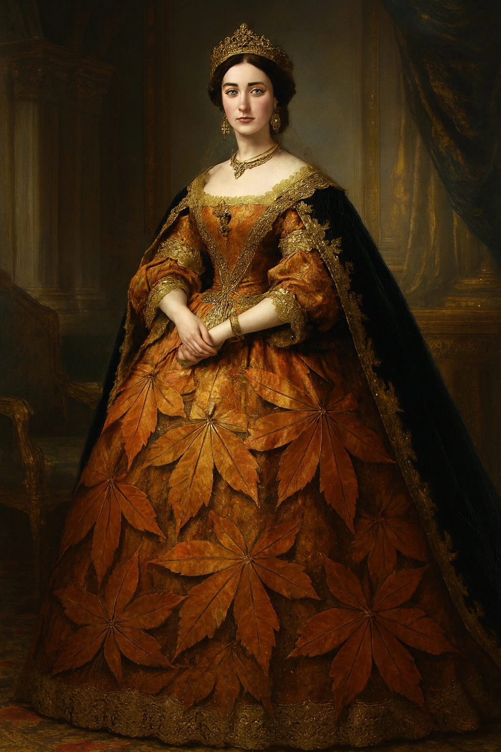 이 단풍 무늬의 드레스를 입어보면 어떨까? 내가 19세기의 왕비가 되어서.