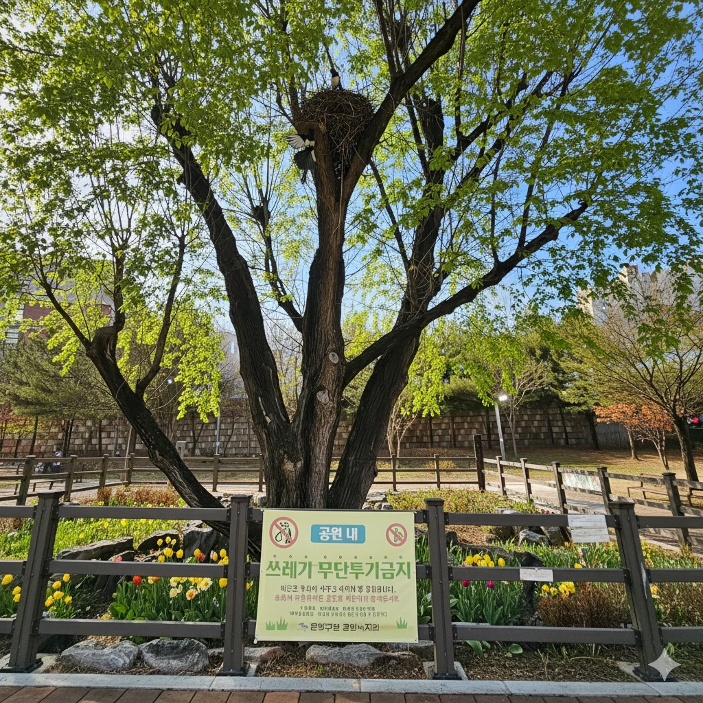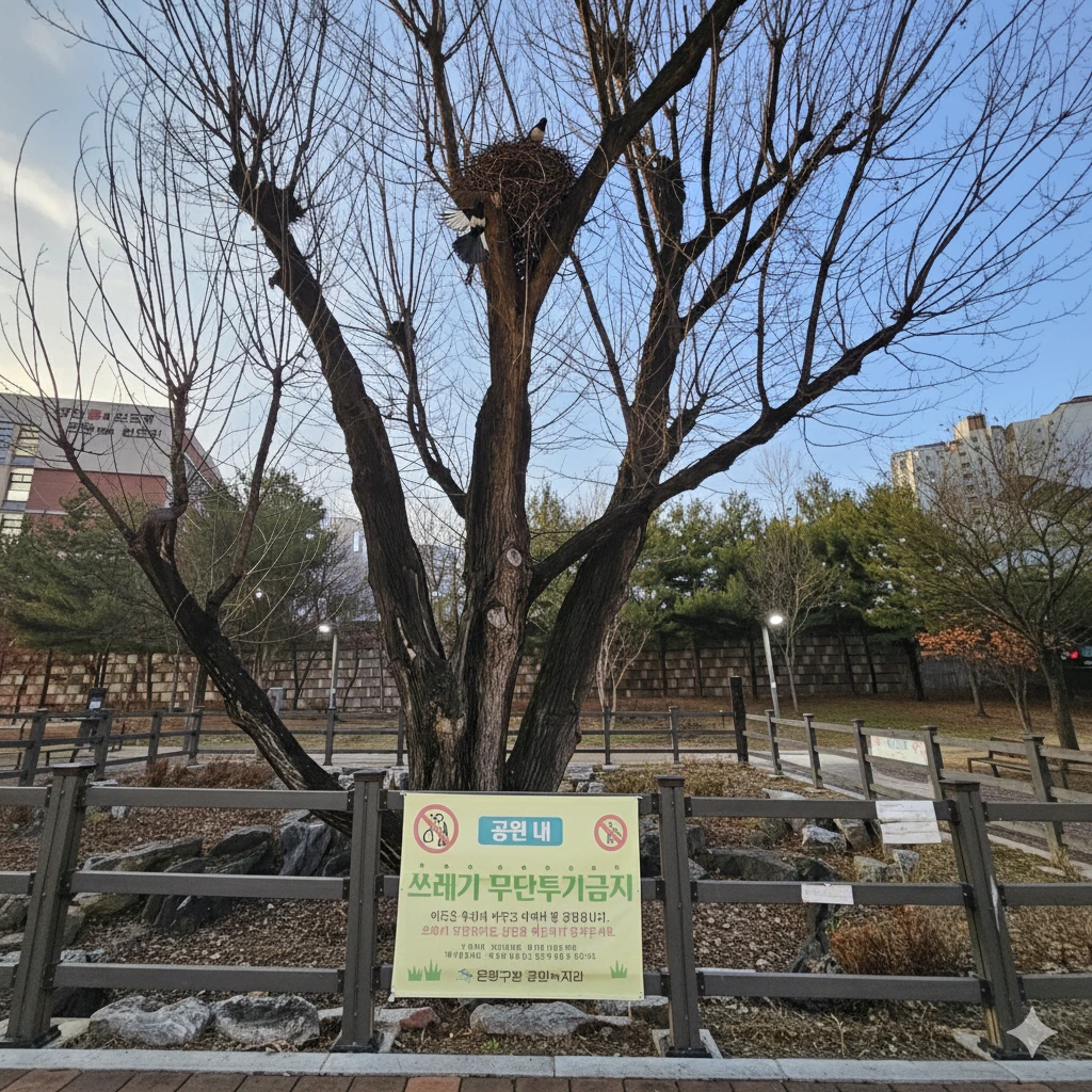울타리가 쳐진 특별한 느티나무에 특별한 까치가 살고 있지 않을까?