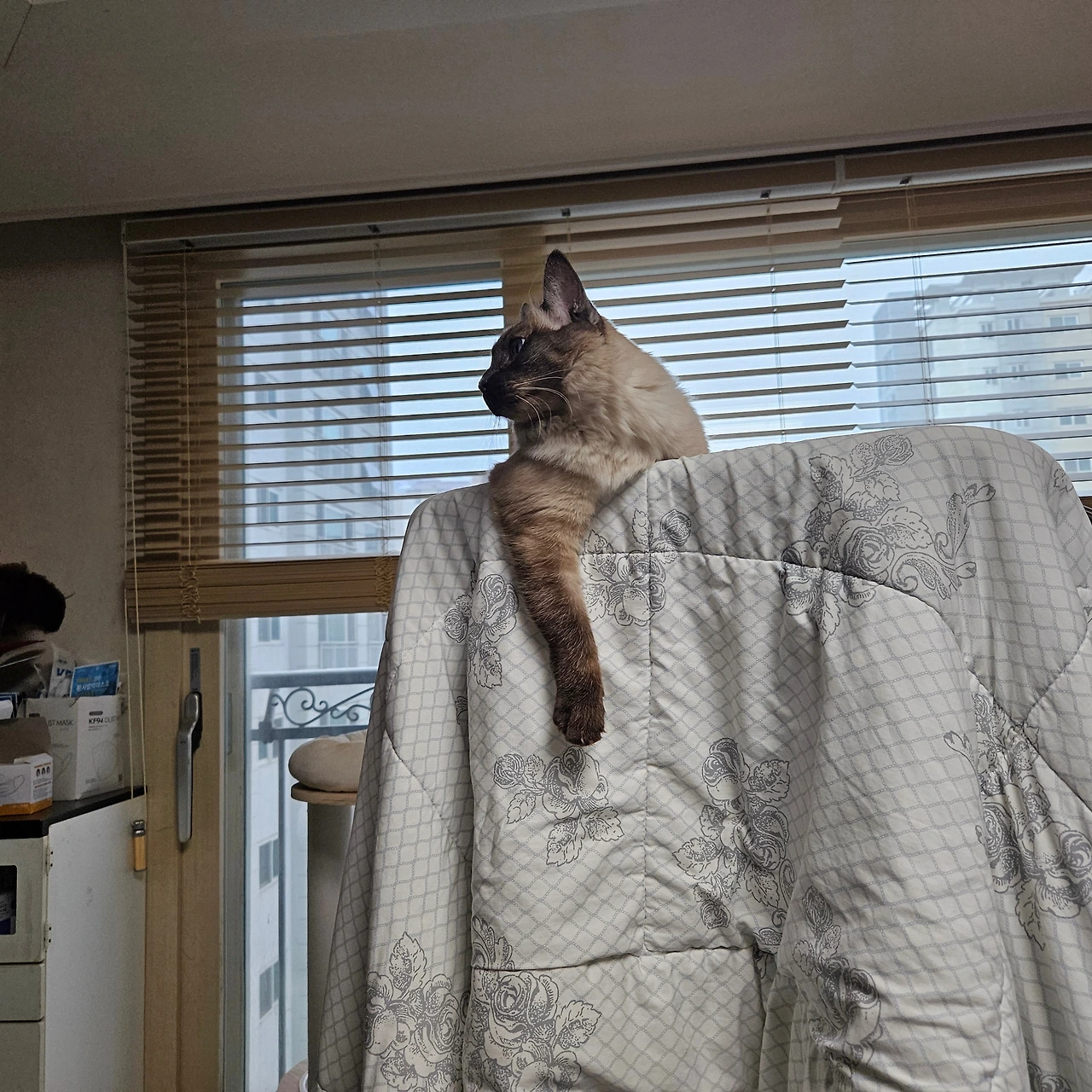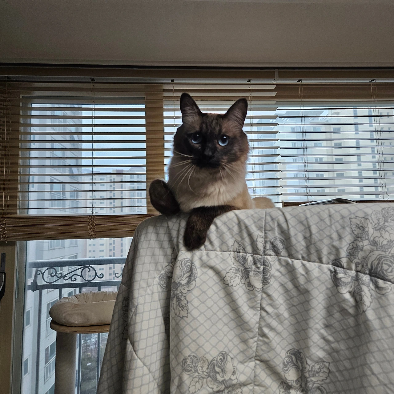 연근이가 못 올라가게 하는 빨래건조대 위를 호시탐탐 노리더니, 오늘 이불 위로 펄쩍 올라갔다.
