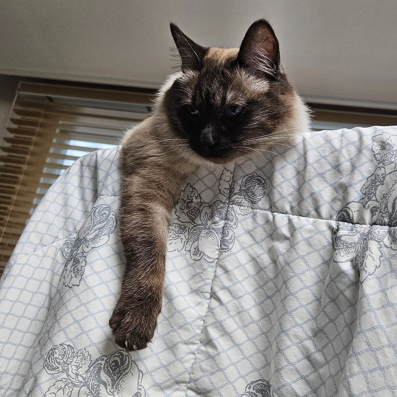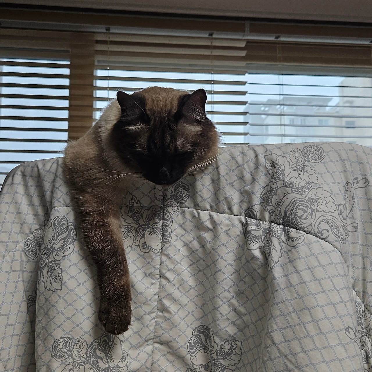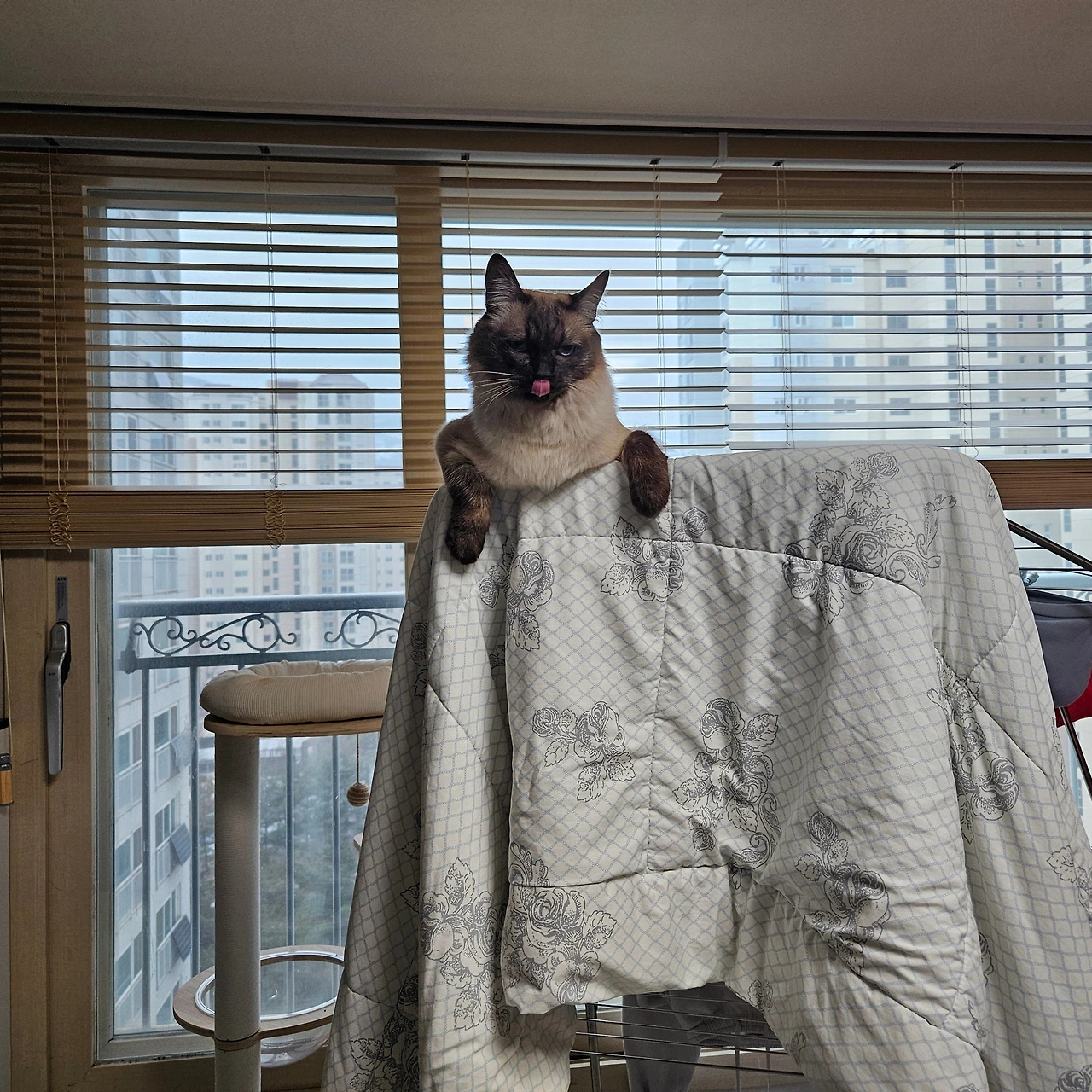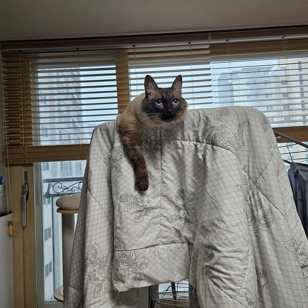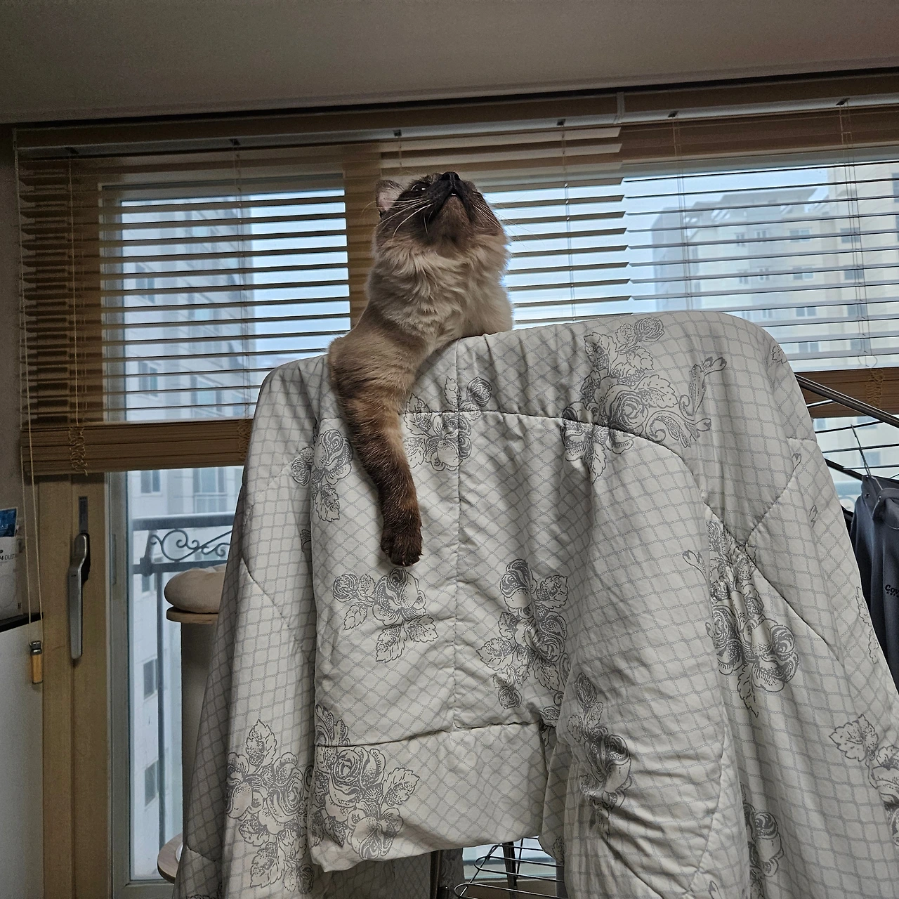 한 번은 빨래 걸이를 징검다리 삼아 곡예를 부리더니, 오늘은 널어 논 이불 위에서 겁도 없이 태평이다. 떨어질 걱정은 안중에도 없다. 빨래건조대 모델이다.