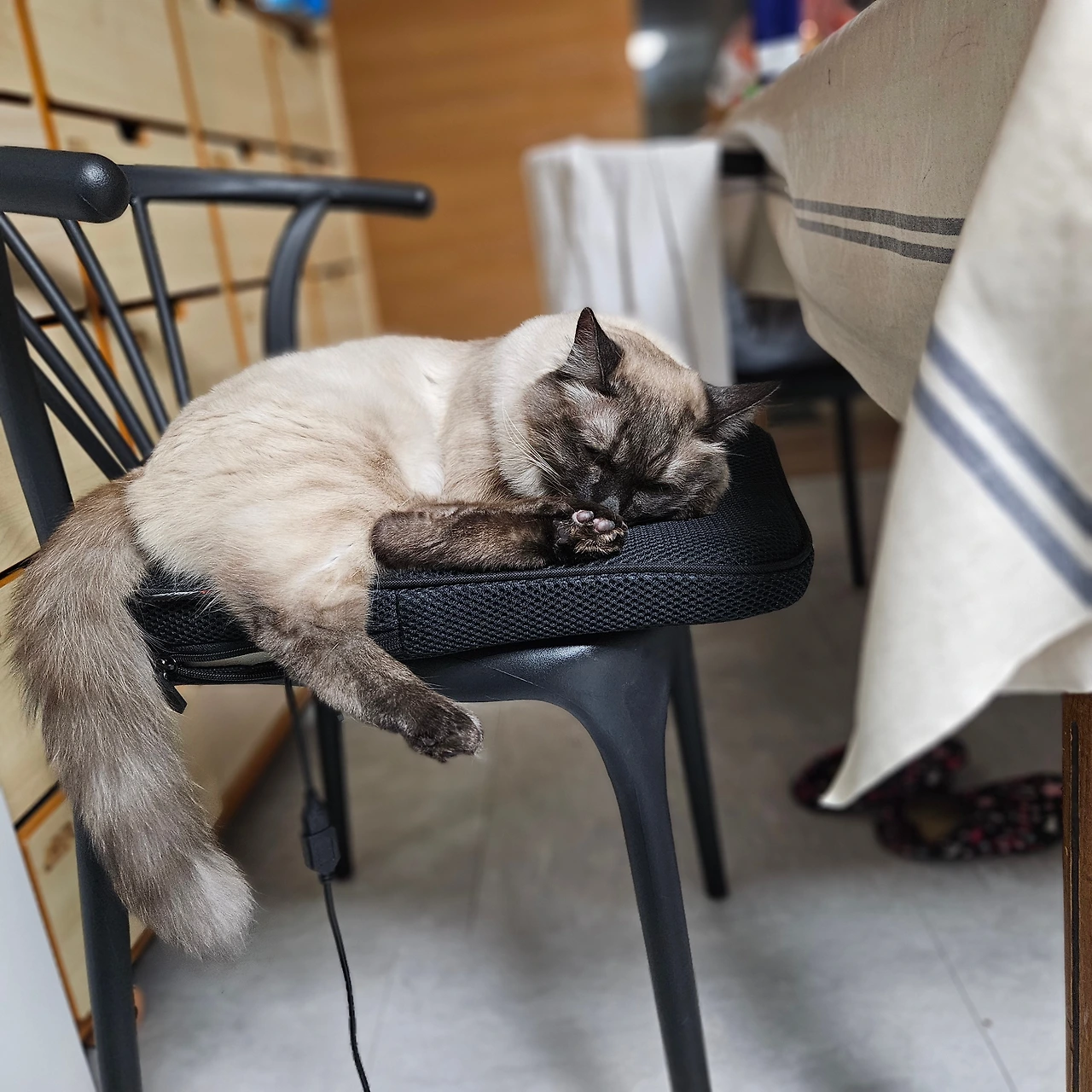 전기방석에 몸을 지지려던 나보다 먼저 올라가 연근이는 쿨쿨 잤다.