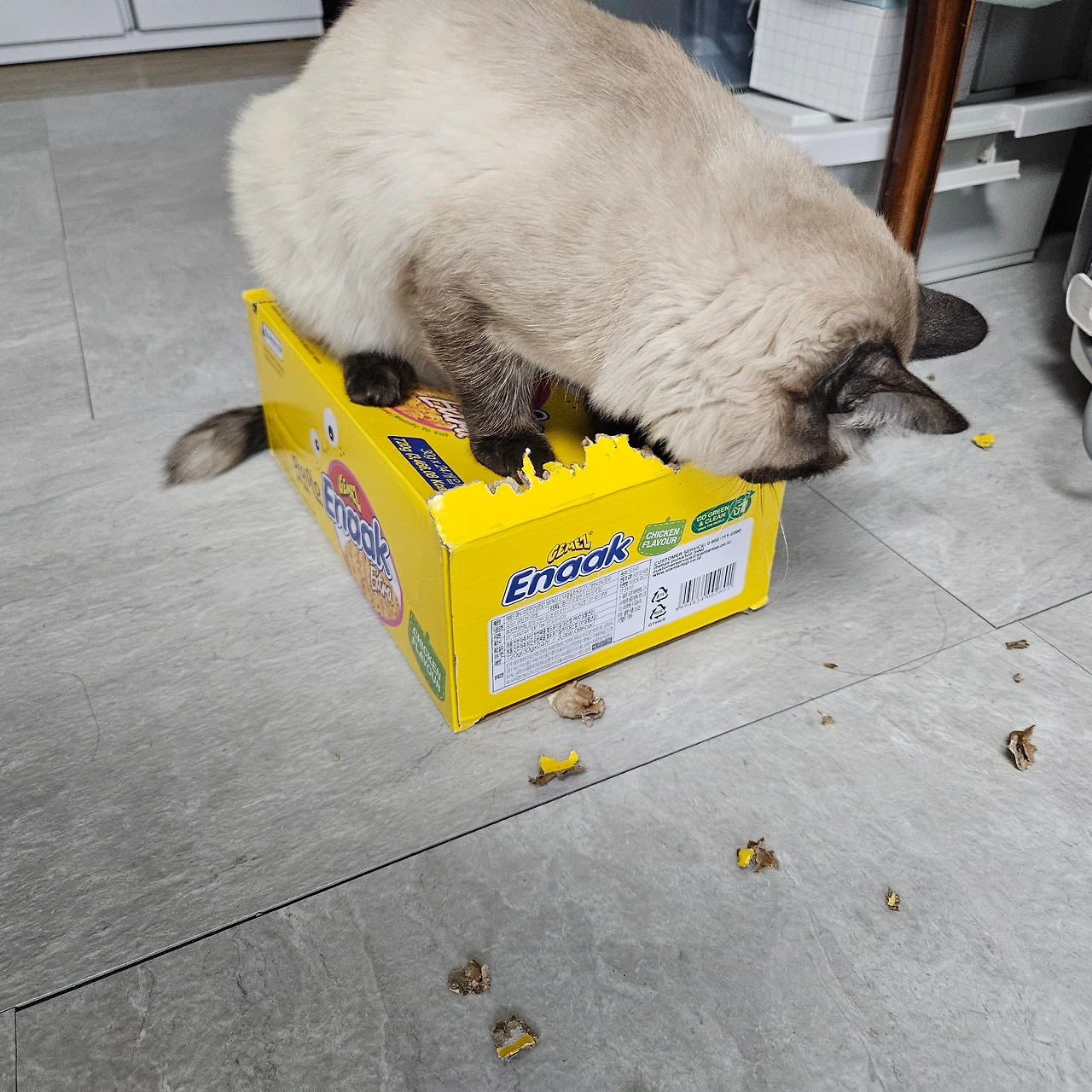 연근이는 혼나기 전에 잽싸게 과자 부스러기를 입 안에 넣고 와그작 씹더니, 다시 박스를 뜯는다.