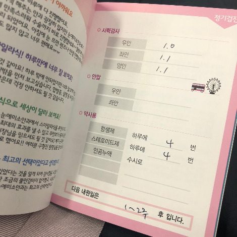 물론 첫 검안할 때처럼 오래 걸리거나 그 종류가 많지는 않다. 좀더 정확한 수술을 위해 하는 수술 전 마지막 체크 정도. 눈 크게 뜨라고 할 때는 크게 뜨고, 버티라고 할 때는 버티는 등 최대한 검안사에게 협조해주려고 노력했다. 환자와 검안사로 만났지만 왠지 모르게 생긴 동지애 때문인지 조금이나마 도움이 되고 싶었달까.