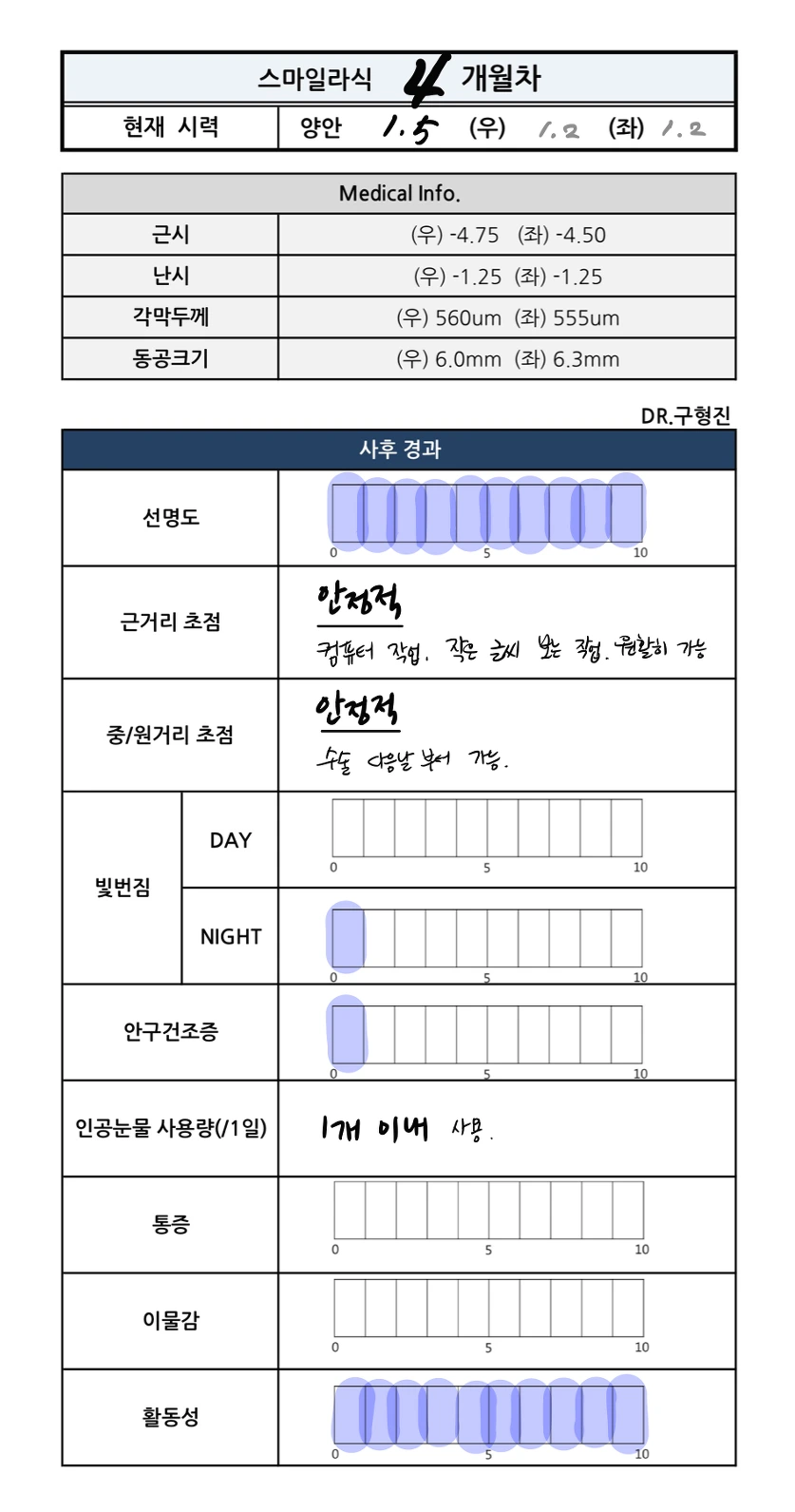 낮(0/10) 빛번짐 증상 없다.