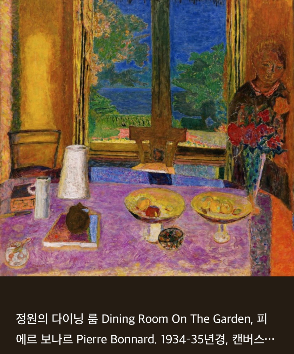 이 도판은 〈후식(La Desserte)>이라는 제목을 가진 1908년의 작품이다. 여기서 우리는 마티스가 보나르가 개척한 길을 따르고 있다는 것을 알 수 있다.