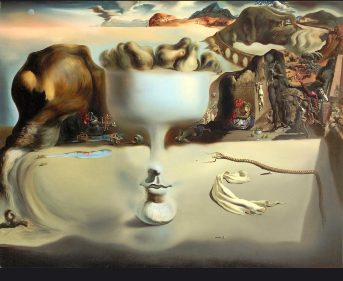 "위 그림을 자세히 들여다보면 오른쪽 윗부분에 꿈의 풍경인 파도치는 만(灣)과 터널이 뚫린 산 등이 동시에 개의 머리를 나타내고 있으며, 개의 목걸이는 바다 위를 가로지르는 고가(高架) 철교로 되어 있음을 알 수 있다. 개는 공중에 둥둥 떠 있고 그 몸뚱이의 중간 부분은 배가 담긴 과일 그릇으로 되어 있으며 그것은 동시에 소녀의 얼굴로 연결되고 있다. 소녀의 눈은 해변에 있는 기묘한 조개껍질로 이루어져 있고 해변 위에는 그 밖의 많은 괴이한 환영이 가득 차 있다. 마치 꿈에서처럼 다른 형태들은 흐릿한 반면 밧줄이나 천 같은 것은 이상스럽게 선명하게 부각되어 있다."(작품에 대한 설명 중)