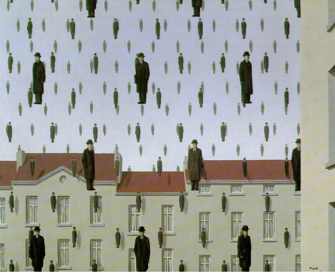 이렇게 꿈에 대한 그림을 그리는 실험은 충분한 가치가 있다고 생각된다. 꿈속에서는 사람과 사물이 서로 합쳐지고 현실적으로 불가능한 것들이 가능해지는 장면들을 이루어낼 수 있다. 위 그림에서처럼 따로 또 같은 신사들이 비처럼 주룩주룩 하늘에서 쏟아지고, 물건들이 풍선처럼 빌딩 숲을 둥둥 떠다닐 수 있고, 우리 집 마당이 아프리카가 되기도 한다. 무엇이든 가능해지는 삼라만상의 세계! 그것을 그려대는 미술가들의 상상력에 힘입어 함께 여행을 떠나는 희열을 맛보게 되는 것이다.