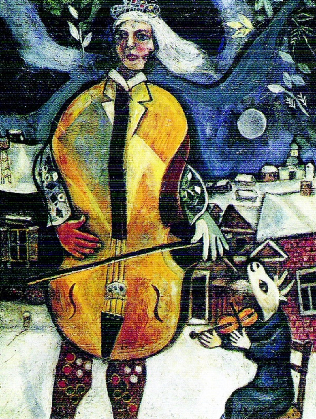 샤갈은 현대 미술의 여러 가지 실험들을 알고 있었지만 그로 인해서 어린 시절의 추억을 잊어버리지는 않았다. 마을 풍경이나 악기와 한 몸이 되어 있는 음악가와 같은 재미있는 인물들이 등장하는 그의 그림들은 진정한 민속 미술이 지닌 묘미와 어린아이 같은 순진한 경이감을 그대로 보존하는 데 성공하고 있다.