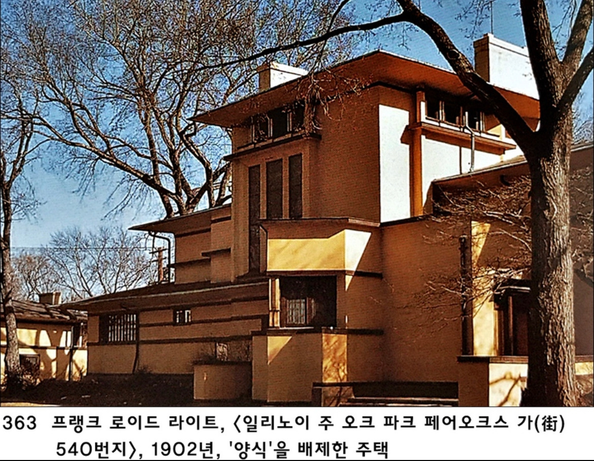 미국 건축가 프랭크 로이드 라이트(Frank Lloyd Wright : 1869-1959)는 주택에서 중요한 것은 방이지 건물 정면의 외관이 아니라고 생각했다. 그는 '유기적 건축(Organic Architecture)'이라는 말을 사용하였는데, 이는 건축물이 거주하는 사람의 요구와 지방의 특색에 따라 살아있는 생명체처럼 발생하고 성장한다는 의미를 지니고 있다. 당시 이는 매우 혁신적 견해였다.
