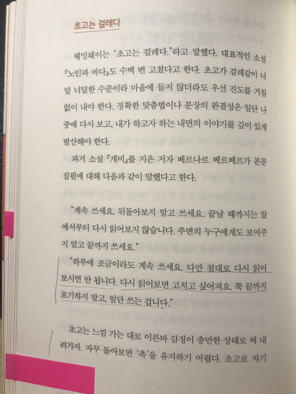 “글 쓰는 중간에 절대 다시 읽어보지 말라. 다시 읽어보면 고치고 싶어 진다. 쭉 끝까지 포기하지 말고 일단 쓰는 거다.”
