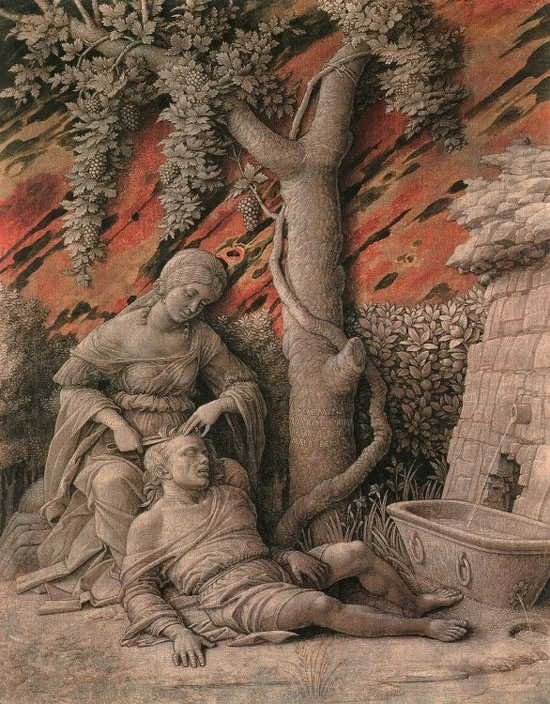 이 극적인 사랑과 배신의 드라마는 예술가들의 창작욕을 끊임없이 자극했다. 그중에서도 주제를 가장 탁월하게 묘사한 작품으로 알려진 르네상스의 巨匠 만테냐(Mantegna, Andrea, 1431-1506)의 '삼손과 들릴라'. 들릴라는 세상모르고 곯아떨어진 삼손의 머리카락을 가위로 자르고 있다. 두 연인 곁에는 우람한 고목이 우뚝 서 있고 그 나무 둥치를 포도 덩굴이 휘감는다.