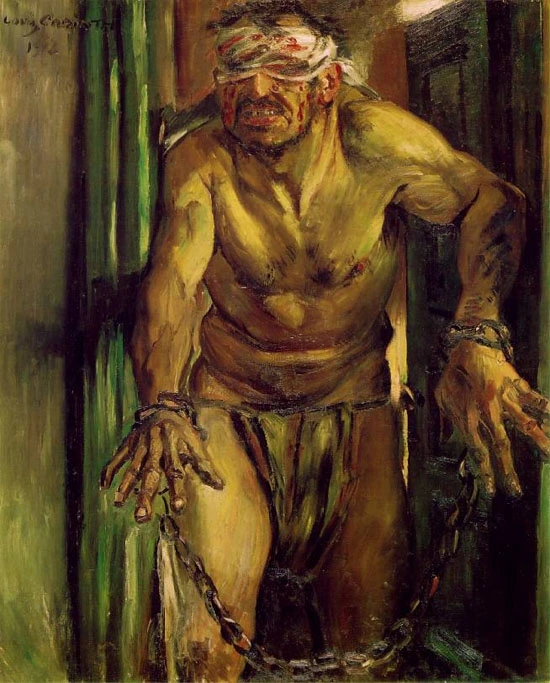 독일 분리파의 창시자요, 표현주의의 선구자인 코린트는 삼손이 원수들에게 복수를 가하는 극적인 순간을 묘사했다. 힘을 잃고 장님이 된 삼손은 어두운 감옥에서 맷돌을 가는 수모를 당하는 동안 그의 머리카락이 자란 것을 느낀다. 다시 옛 힘을 되찾은 삼손은 필리스티아인들 축제 날, 신전을 지탱하는 두 기둥을 흔들어 건물을 파괴하고 적들과 함께 최후를 맞는다. 지금 이 장면은 초인적인 힘이 되살아난 삼손이 온몸을 비틀어 무쇠 같은 두 팔로 기둥을 밀어내는 긴박한 순간을 표현했다. 복수의 화신이 된 그의 얼굴에서 소름 끼칠 만큼 강한 분노와 울분이 뿜어져 나온다. 사랑을 저버린 여인에 대한 증오가 그를 저토록 미쳐 날뛰게 만든 것일까?