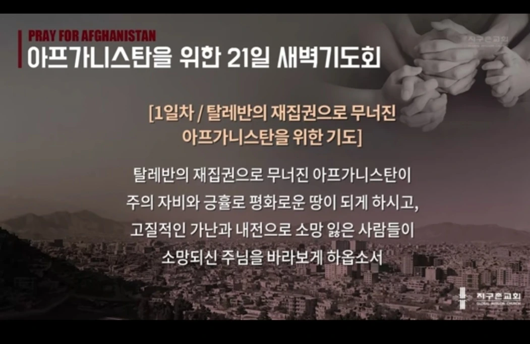 특별히 아프가니스탄을 위한 새벽기도회를 마련한 교회를 축복하시고, 하나로 통하는 성도들의 간절한 기도에 응답하소서!