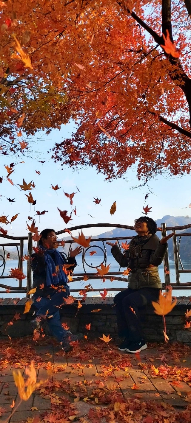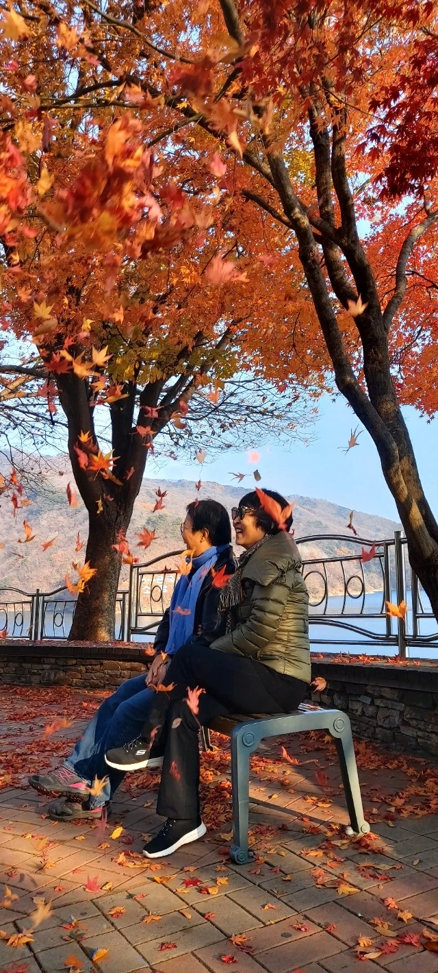 “현진샘 거기 바닥에 떨어진 단풍 모아봐요~ 그리고 두 여인들 여기 벤치에 앉아봐! 현진샘 내가 go 하면 단풍 한가득 집어 여인들에게 날려봐~ 내가 오늘 인생사진 찍어줄겨~~”