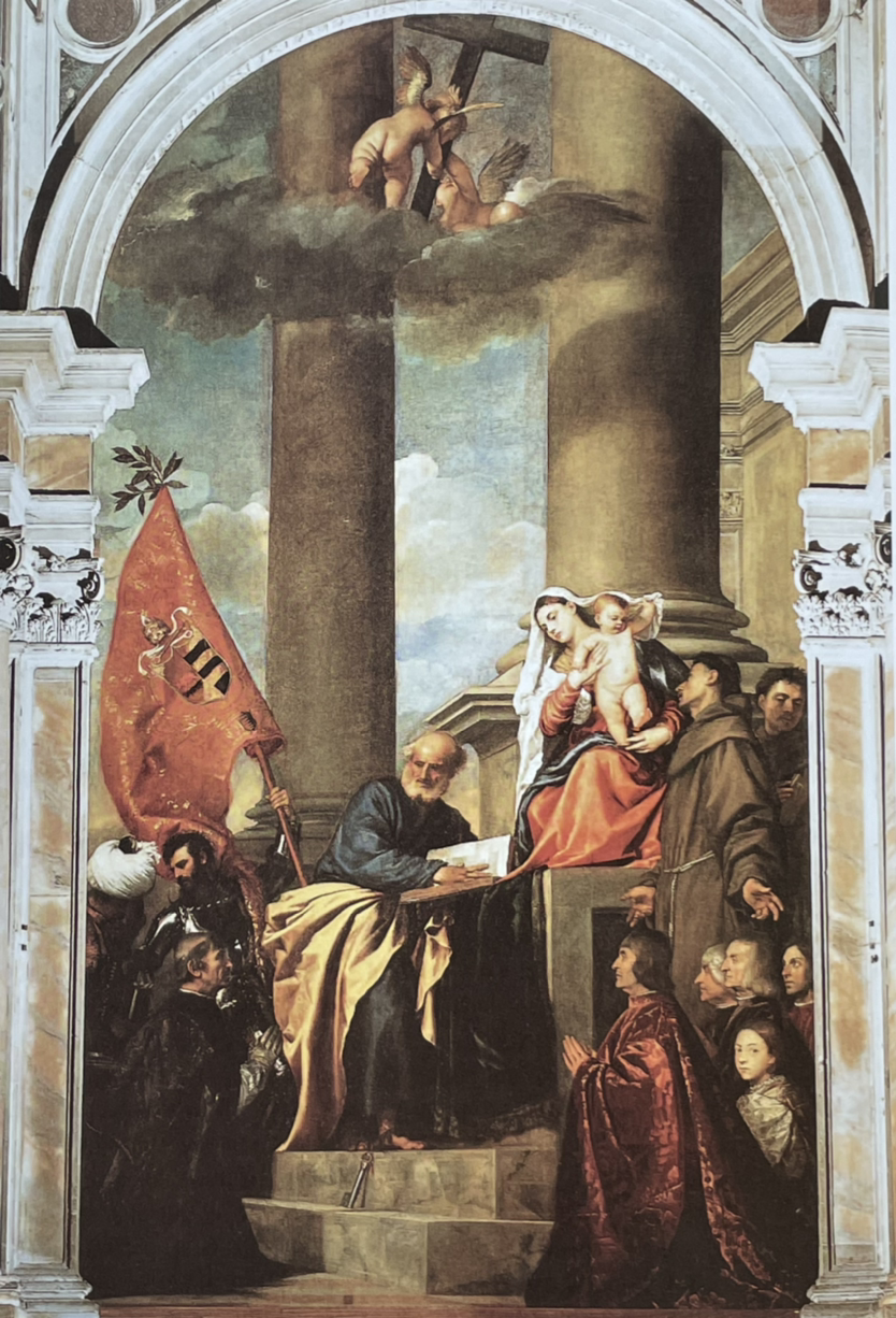 이 예기치 않은 구도는 전체적인 조화를 깨트림 없이 오히려 그림을 생기 있고 활기차게 만들어주었다. 그것은 티치아노가 빛과 공기와 색채로써 이 장면을 통일시켰기에 가능하였다. 단순한 깃발(그림의 왼쪽, 기수가 손에 든 깃발) 하나를 가지고 성모의 모습과 대칭을 이루게 했던 것이다. 이 깃발의 풍요롭고 따뜻한 색채! 이것은 그의 모험을 완전한 성공으로 이끈 놀랄만한 한 끗이 되었던 것이다!!