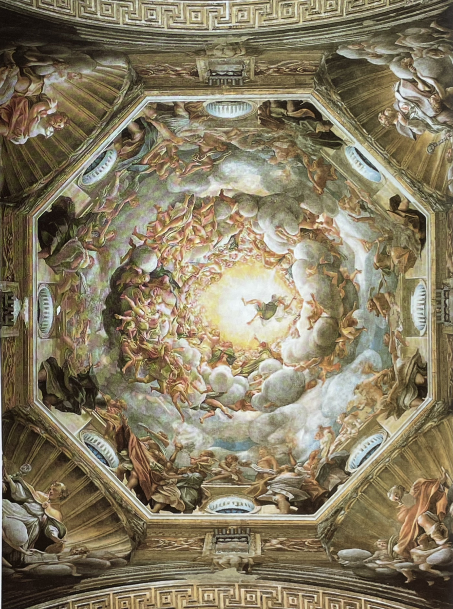 그는 교회 안에 있는 신도들에게 천장이 열려 있으며, 하늘의 영광을 바라보고 있다는 환상을 주려고 노력했다. 빛의 효과를 자유자재로 조정하는 그의 능숙한 기술로, 그는 햇빛을 가득 받은 구름으로 천장을 채우고 그 구름들 사이로 천사들의 무리가 다리를 아래로 늘어트린 채 빙빙 떠돌고 있는 것처럼 보이는 이 그림을 그릴 수 있었다.