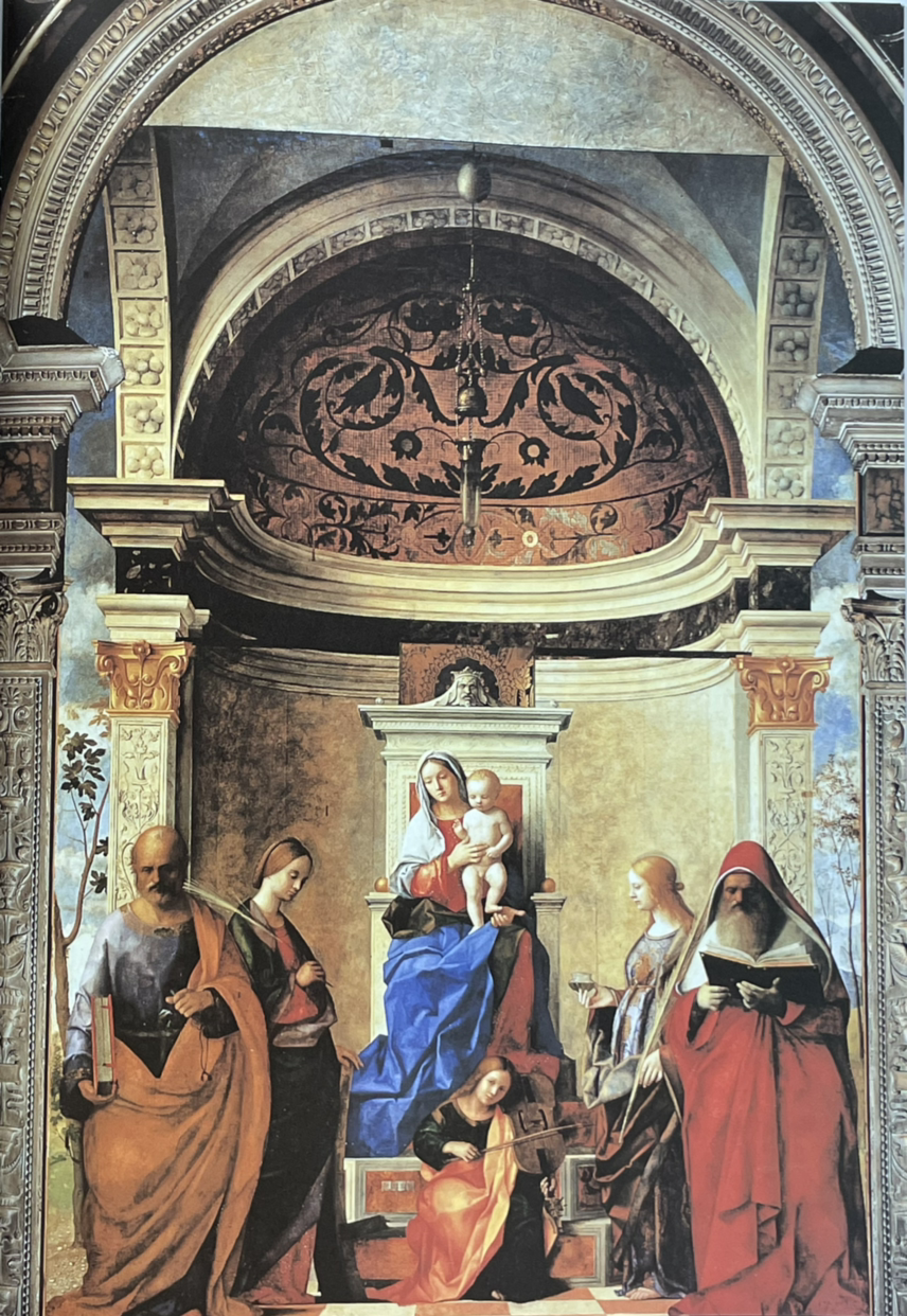 "베네치아 화가 조반니 벨리니(Giovanni Bellini : 1431?-1516)가 1505년에 산 차카리아의 작은 교회의 제단에 그린 이 그림을 보면 색채에 대한 그의 접근법이 매우 달랐다는 것을 알아볼 수 있다. 우선 부드럽고 다채로운 색채들이 우리에게 강렬한 인상을 준다. 여기에 실린 도판으로도 성모 마리아가 앉아 있는 옥좌가 놓인 황금색의 빛나는 벽감에서 넘쳐흐르는 따뜻한 분위기를 짐작할 수 있으리라 생각된다."