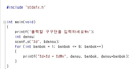 위 프로그램은 visual studio express 2013 버전에서 코딩한 예제입니다. 기본적으로 C언어는 표준라이브러리를 제공하고 위와 같이 구구단을 화면에 출력하려면 입력,출력을 할 수 있도록 미리 만들어진 표준함수를 포함시키면 됩니다. #include “stdafx.h” 는 표준 어플리케이션 프레임워크를 포함하라는 의미이고 이 헤더파일 안에 stdio.h가 있습니다. stdio.h는 표준 입출력 함수를 포함한 라이브러리 입니다. 여기까지가 헤더파일에 대한 부분이고 다음 세 번째(더하기)에서는 메인함수 부분을 같이 볼까요?