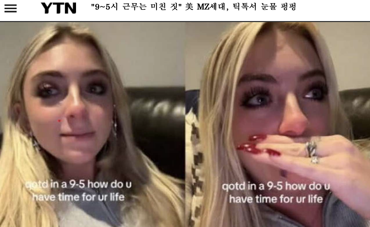 얼마 전 인터넷상에서 화제가 된 영상이 있다. 오전 9시부터 오후 5시까지(9 to 5) 근무를 처음 경험해 본 미국 사회초년생이 눈물을 흘리면서 '이렇게는 못 산다'라고 하소연하는 틱톡 영상이다.