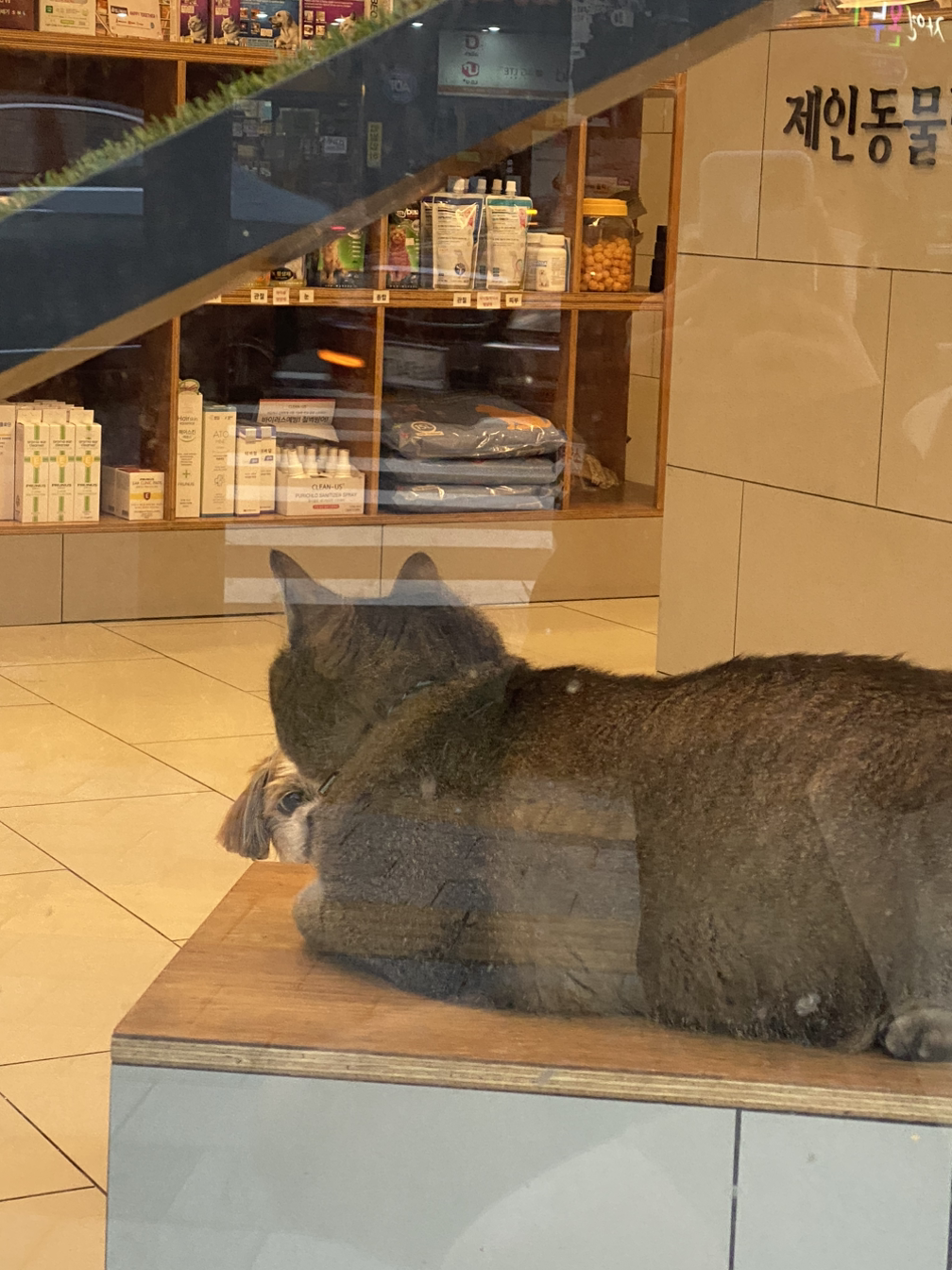 성수 구길 사거리에 있는 동물병원에는 터줏대감인 뚱냥이가 있다. 시츄 친구의 눈빛이 압권이다.