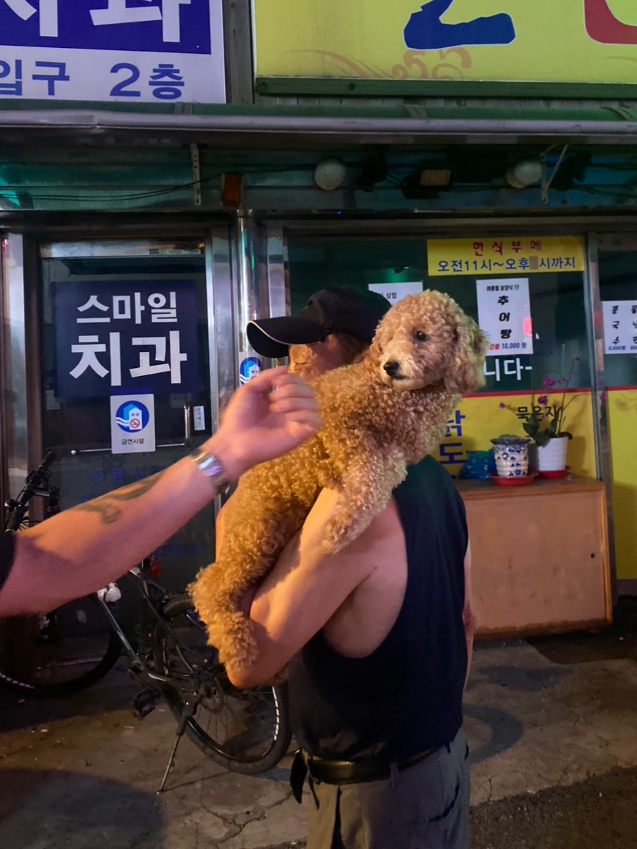 푸들을 보고 무장해제된 우리는 나지막이 귀여워를 외쳤고, 험악할 거라고 예상했던 아저씨는 반달 웃음을 지으시면서 ‘이 아이 이름은 행복이 이며, 겁이 많아서 걷질 않으려고 해서 들고 가는 중’이라고 말씀하셨다.