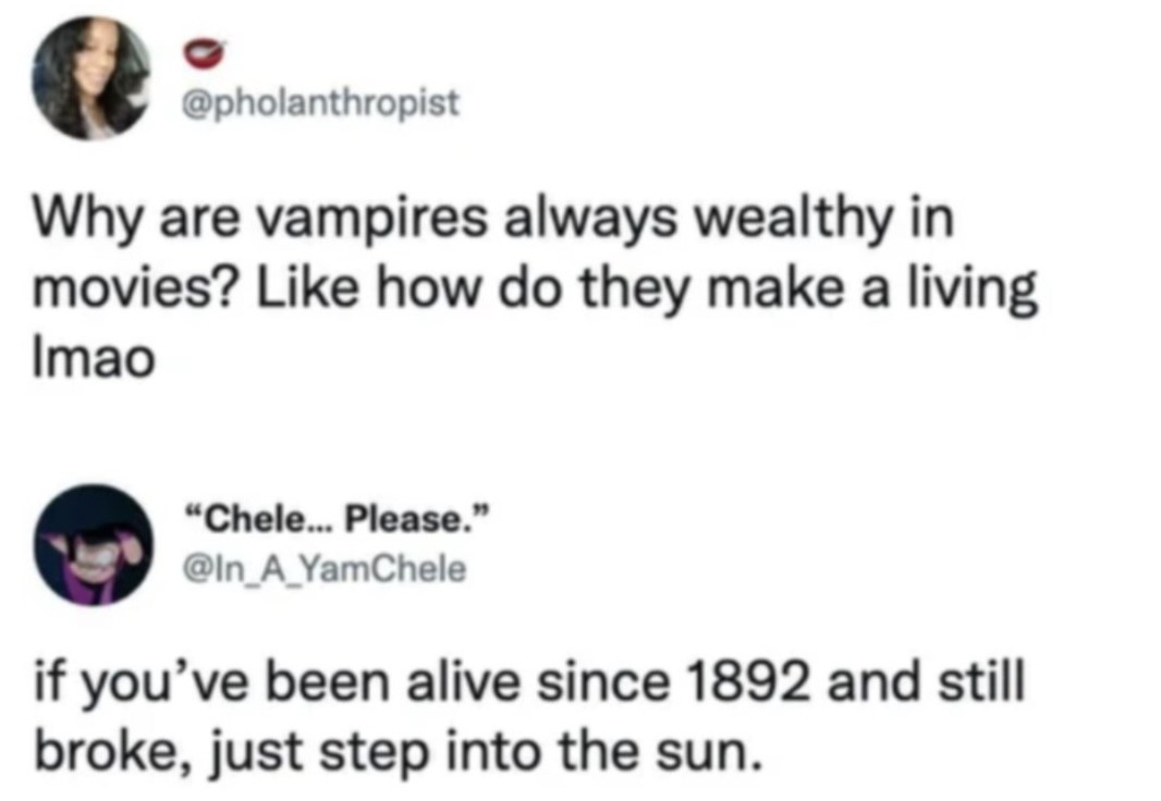 최근에 인터넷에서 재밌는 사진을 보았다. "뱀파이어는 왜 모두 부자인가? 어떻게 살아갔길래?"라는 질문에 "1892년부터 살아왔는데 가난하다면, 그냥 태양 밑으로 걸어가라(죽자)"는 내용의 SNS 캡처였다.