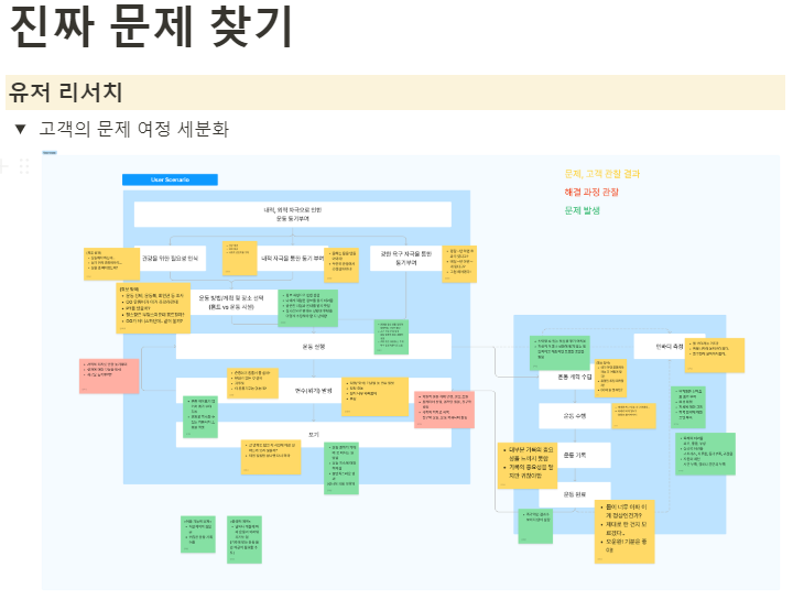 구조화된 고객 여정에서 중복적으로 관찰되는 현상은, 반드시 불편함을 겪거나, 문제점도 있었지만, 행동 패턴이나 주로 겪는 경험이나 생각 등도 많았다. 이를 정리하기 위해 '문제 발생', '문제 해결법', '그 외 관찰 양상'을 다른 색상의 포스트잇으로 위 사진처럼 피그마로 정리했다. 이 내용을 토대로 운동 포기를 유발하는 빈번한 원인은 변수 또는 위기를 발생하는 것임을 알 수 있었다. 예를 들면 앞에서 이야기한 것처럼 "월, 수, 금 운동 루틴 중인데, 이번 주 수요일은 회식이네..", "10회씩 3세트를 못했는데, 괜찮나?", "이 루틴을 따라 하기에는 너무 버거운데.."등의 운동 시작 전부터 운동 중에서까지 맞이하는 다양한 변수 또는 위기를 맞이하는 것이다. 이러한 변수가 반복되다 보면 큰맘 먹고 목표한 운동 계획과 루틴들은 무너질 대로 무너지게 되는 상황이 된다.