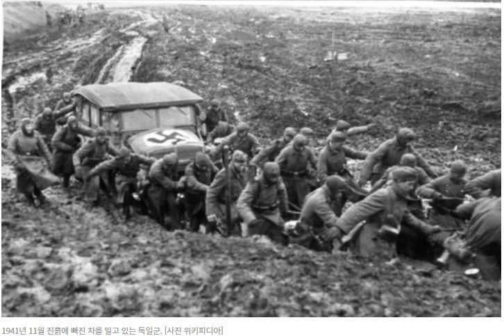 히틀러의 군대는 무리한 공격으로 패전을 자초하였다. 폴란드를 전광화석으로 점령한 중앙 집단군은 모스크바를 목전에 두고두고 인접부대와 전선 조정, 병참 등을 위해 6주간 정군하여 귀한 시간을 낭비하였다. 이윽고 공격을 재개했으나 일기가 불순하고 기온이 급강하하자 군은 철수를 건의하였으나 히틀러는 무리한 공격명령을 내렸다. 라스프티챠 속에서도 악전고투하며 11월 하순 모스크바 전방 40km까지 진출하였고 정찰병은 크렘린을 육안 관측한 거리까지 진출하였으나 갑자기 기온이 영하 40도로 급강하하였다. 동계작전 준비가 안 된 독일군은 더 싸우기 어려워졌다. 공세가 중지되었고 패전의 길로 들어섰다.