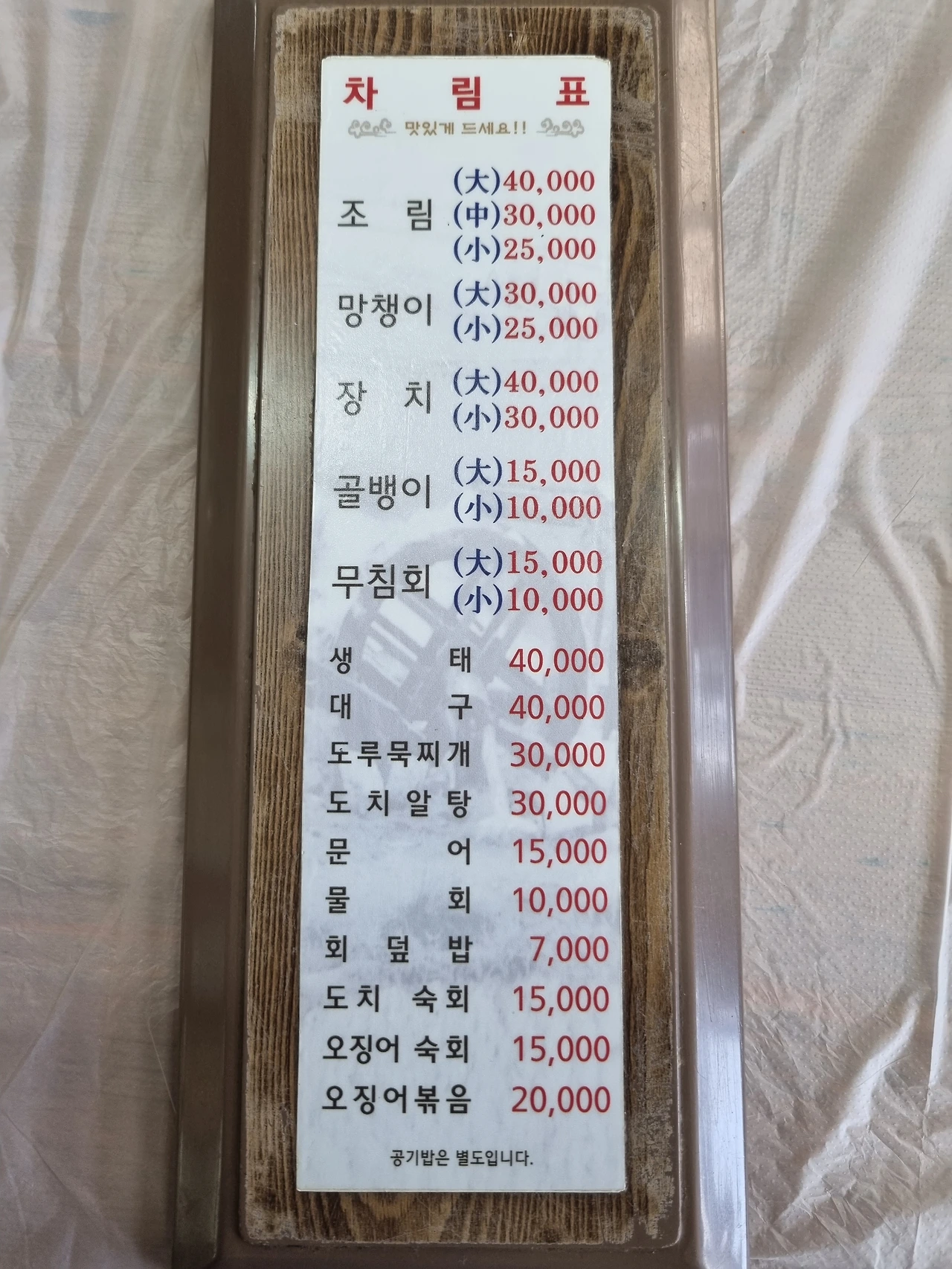 메뉴표에 장치와 망챙이가 재미있다. 두 고기가 예전에는 고기 취급도 안 했었는데 요즘은 몸값이 높아졌다.