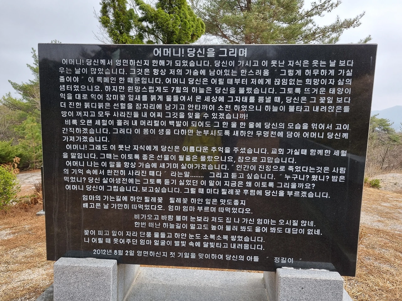 어머니 비석 글은 남편을 일찍 여의고 7남매를 힘겹게 키우시다 병중에 선혈을 남기고 소천하신 어머니에 대한 그리움과 헌신에 대한 감사와 사랑을 적었고, 고향을 그리는 ‘찔레꽃’을 말미에 애절하게 불렀다.