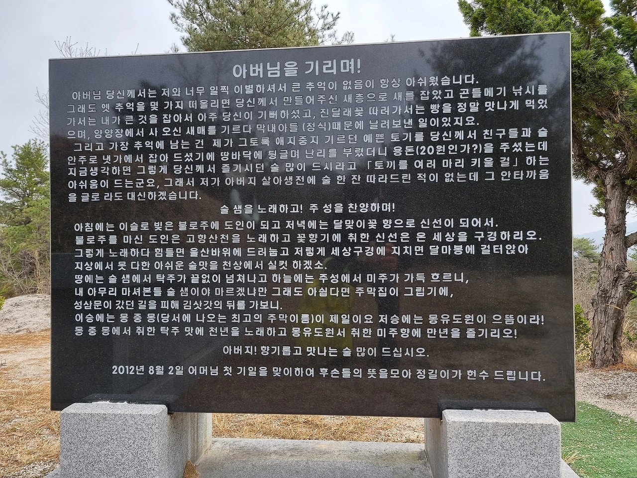 부모님 묘소는 북에 두고 온 고향 함흥을 아스라이 볼 수 있는 노학동 무명고지 정상에 모셨다. 부모님이 동해바다를 보고 평안히 영면하시라 모신 곳이지만 묘소 위치가 산 꼭대기라 마사토가 푸석거려 잔디관리가 어려워 보인다.