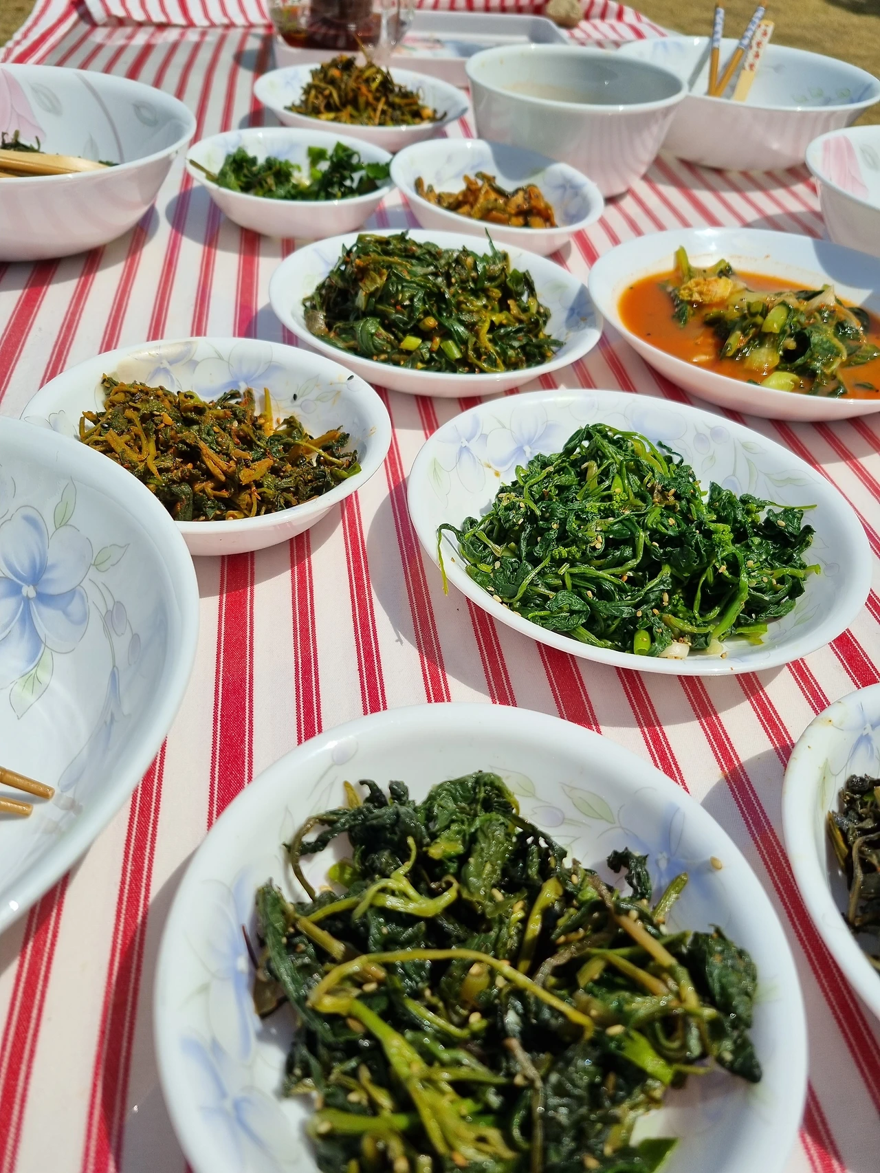 이윽고 준비된 산나물 대잔치. 도대체 몇 가지인가? 다 알아볼 수 없어서 일일이 기록했다. 삼채, 머위나물, 취나물, 원추리, 방풍나물, 돗나물, 참나물, 참두릅, 엄나무, 능개숭마... 귀한 봄의 전령사들이다.