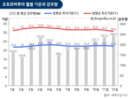 이곳의 열대지방으로 습윤한 열대기후를 나타낸 다. 연평균 27°C 정도로 거의 일정하며 강수량은 2,500mm 내외라 한다. 월별로 보았을 때 1~2월과 6~9월이