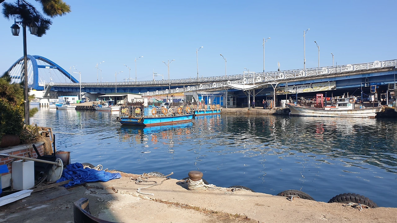 건너편 청호동 수협위판장에선 경매 준비를 위해 바다에서 갓 잡아 온 싱싱한 생선이 내리는 선원들의 손길이 바쁘구나. 외국인 선원들도 자기 배의 매출이 잘 나오길 두 눈 부릅뜨고 바라보며, 중개인들은 손놀림이 분주하다. 낙찰된 생선들은 바로바로 중앙시장과 시내 곳곳의 식당으로 가서 손님을 기다린다. 요즘 빠지지 않는 단골은 가자미, 곰치, 도치다. 홍게도 드문드문, 고등어는 가끔씩 얼굴을 내민다.