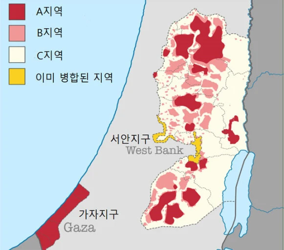 *** 팔레스타인 자치정부에는 세속주의 성향의 '타파당'과 원리주의 성향의 '하마스'로 양분되어 '요르단 서안지구'와 '가자지구'를 각각 실효지배하고 있다.(A 팔 단독, B 공동, C 이 단독 관할)