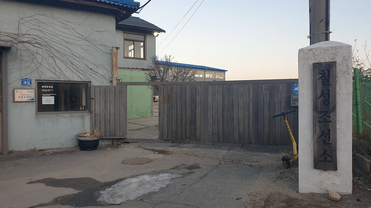 왠지 발걸음이 끌려 들어섰다. 새로 지은 모텔을 지나자 막다른 길에 큰 목제 대문이 길의 끝임을 알리는데 분위기기가 조금 이상했다. 뭔가 있었다. 입구에 가니 목제간판에 칠성조선소라고 쓰여있고 안에 인적이 느껴진다.