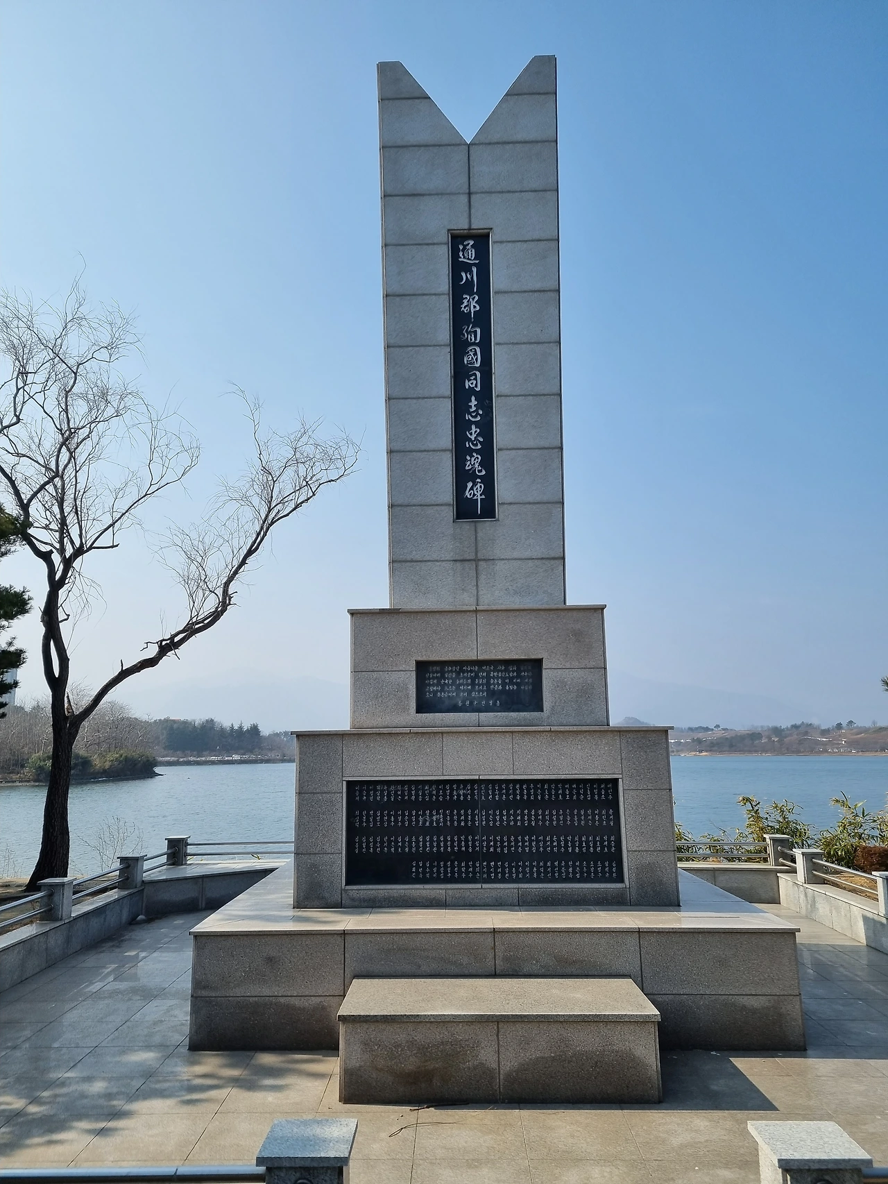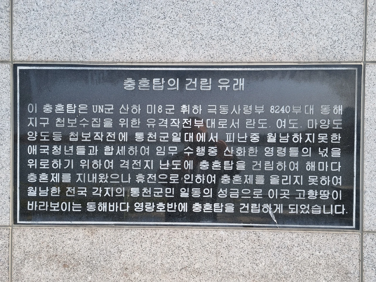또 하나가 보인다. 속초도립병원 좌측 호수변에 보이는 ‘통천군 순국동지 충혼비’다. 전쟁시 UN군 휘하 극동사령부 첩보수집부대 요원으로 원산~함흥 앞바다의 섬(난도,여도,마양도)에서 첩보수집 및 유격작전을 수행하다 산화한 114위의 영령들을 기리는 충혼탑이 있다. 이곳에 설치된 사연은 다음에 자세히 설명하겠다.