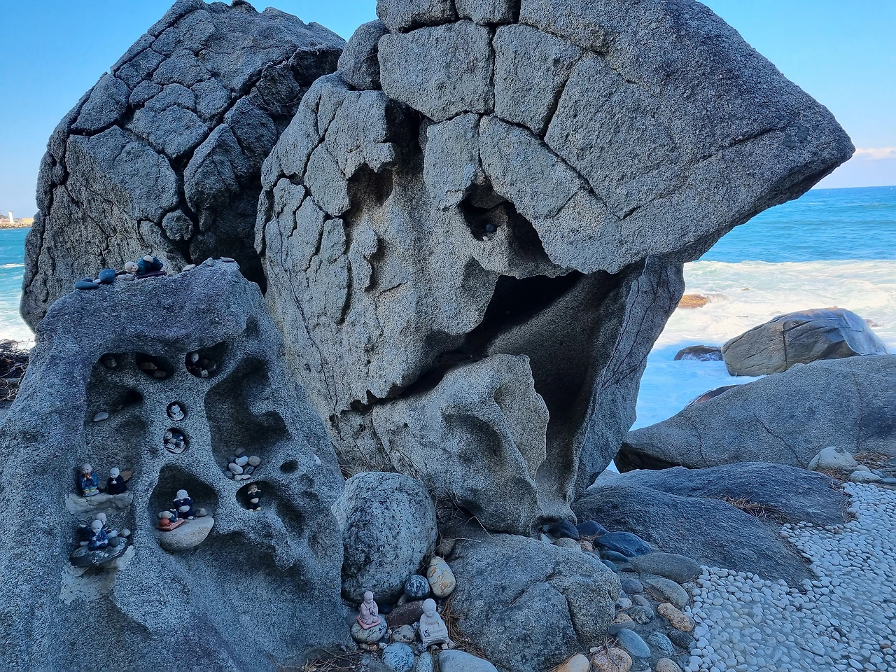 죽도 해안선을 따라 만들어진 둘레길이 훨씬 나아 보인다. 기암괴석과 철석 거리는 파도소리를 감상하면 시름도 잠시 잊을 것이다. 내가 방문하던 날은 파도가 높아 인구항 쪽 둘레길 출입문은 폐쇄되었으나 정상에서 내려가 기암괴석 3종 세트(선녀탕, 부채바위, 신선바위)를 감상하고 죽도암 방향으로 돌아 나왔다. 돌아가는 길 파도가 장난이 아니다. 아내가 무서워 하지만 좋아한다.